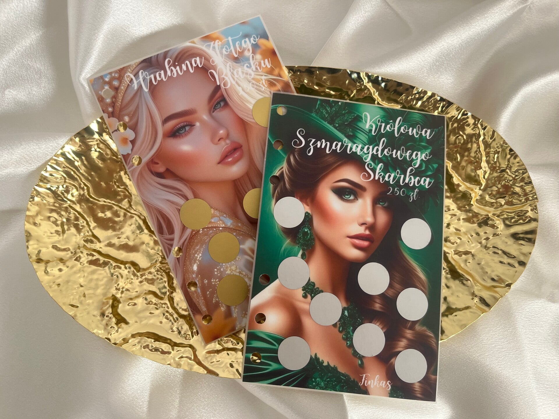 Zdrap zdrapkę, odkryj kwotę i wrzuć ją do koperty lub skarbonki. Piękne ilustracje wygodne wpinanie do segregatora idealne do planera budżetowego. Idealne na start przygody z oszczędzaniem lub jako pomysłowy prezent.